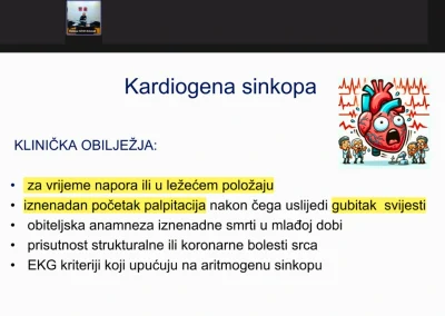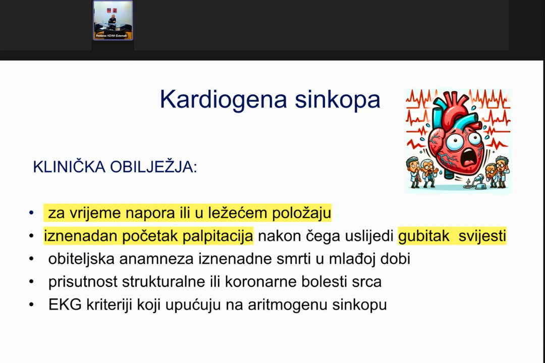 „Sinkopa je iznenadni, netraumatski, prolazni gubitak svijesti s gubitkom tonusa zbog prolazne hipoperfuzije mozga“, rekla je na predavanju doktorica Bogdanović i naglasila da ju karakterizira brzo nastajanje, kratko trajanje (do 20 sekundi) te spontani i potpuni oporavak. Mogu joj prethoditi simptomi poput omaglice, vrtoglavice, slabosti, glavobolje, umora, mučnine, zamagljenja vida, znojenja i slično, a iako je većinom riječ o benignim uzrocima, sinkopa može upućivati na ozbiljne zdravstvene probleme stoga je važno razumjeti njezinu etiologiju.